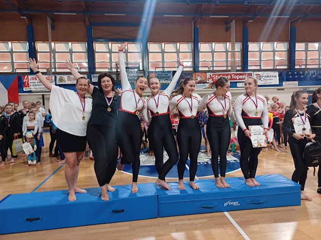 Během soboty si sportovci z různých oddílů celé republiky poměřili své síly v několika kategoriích. Diváci měli možnost sledovat precizně provedené skoky z trampolíny, úchvatné akrobatické sestavy a působivé akroprvky na tumblinku. Atmosféra byla nabitá emocemi a každé vystoupení bylo odměněno burácivým potleskem. Představila se i všechna závodní trutnovská družstva Junior I (do 11let), Junior II (do 16let) a Senior. Nejlépe se dařilo „jedničkám“, které vsadily na vysokou obtížnost prvků a vyplatilo se! Jejich výkon ohodnotily rozhodčí třetí nejvyšší celkovou známkou, což přineslo bronzové medaile a neskutečnou radost celého týmu i oddílu. „ Dvojky“ se pro tentokrát musely spokojit s bramborovou pozicí, škoda některých chyb, které je stály bronz. Ale i tak v konkurenci deseti týmů krásné umístění. Do seniorské kategorie se nepřihlásilo žádné „cizí“ družstvo, a tak si místní děvčata v početním oslabení vyzávodila svým důstojným výkonem zlato.